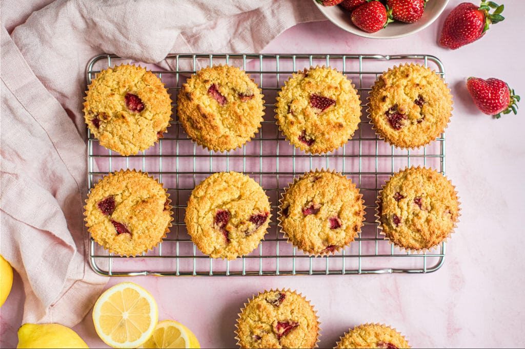 In a large bowl, combine the almond flour, coconut flour, arrowroot flour, baking soda, baking powder, sea salt and lemon zest. Gently fold the flour mixture into the egg and lemon mixture. Gently fold in the strawberries.